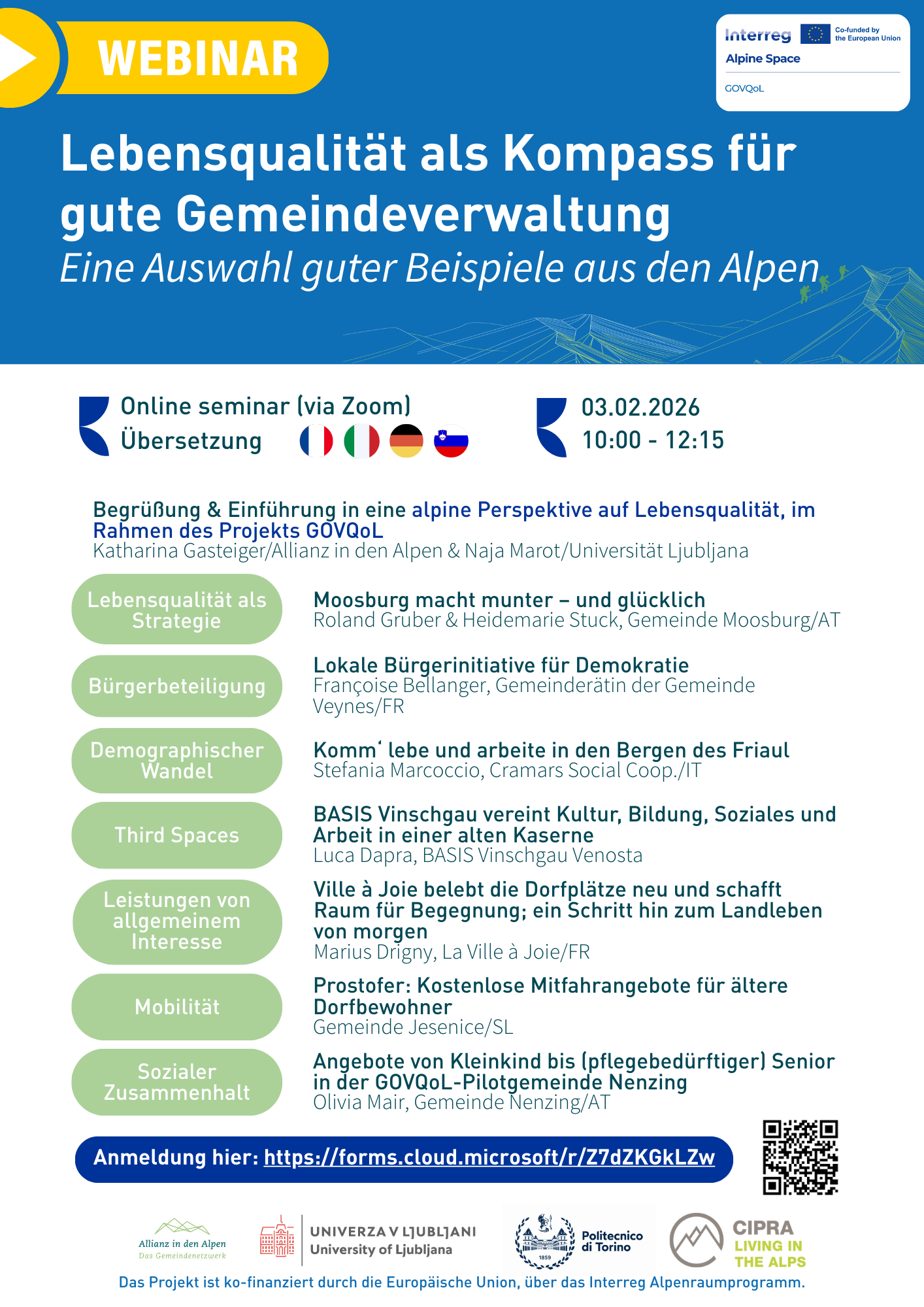 Dienstag, 3. Februar, 10:00-12:00 Uhr: Einführung in das Thema „Lebensqualität als Kompass für eine gute Gemeindeverwaltung“. Es werden bewährte Verfahren für gute Governance im Bereich Lebensqualität vorgestellt. Das Seminar wird in die wichtigsten Alpen-Sprachen gedolmetscht: Französisch, Deutsch, Italienisch und Slowenisch.
